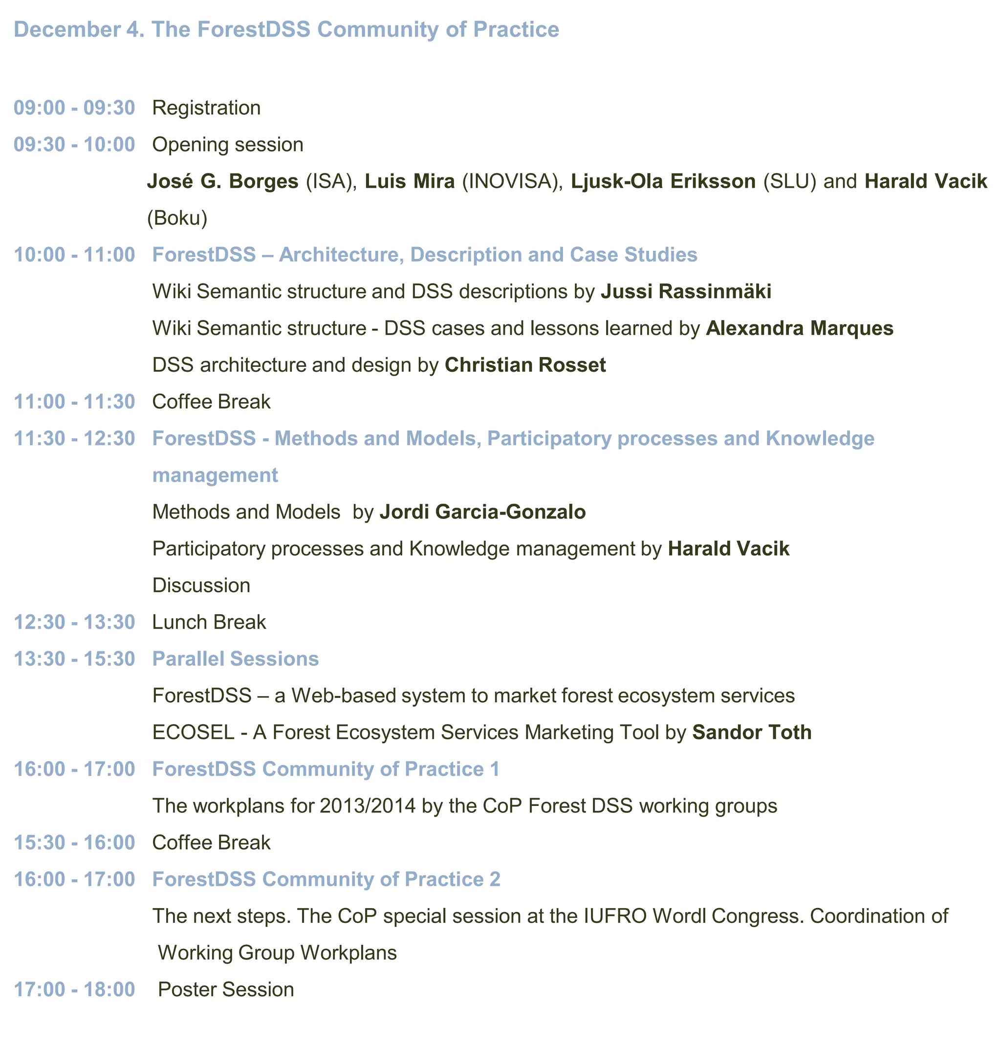 This document outlines the agenda for a ForestDSS Community of Practice meeting held on December 4-6. The meeting included opening and closing sessions, presentations on ForestDSS architecture and case studies, discussions of methods/models and participatory processes/knowledge management, parallel sessions demonstrating decision support system tools, and computer labs providing hands-on experience with various forest management DSS tools and models.