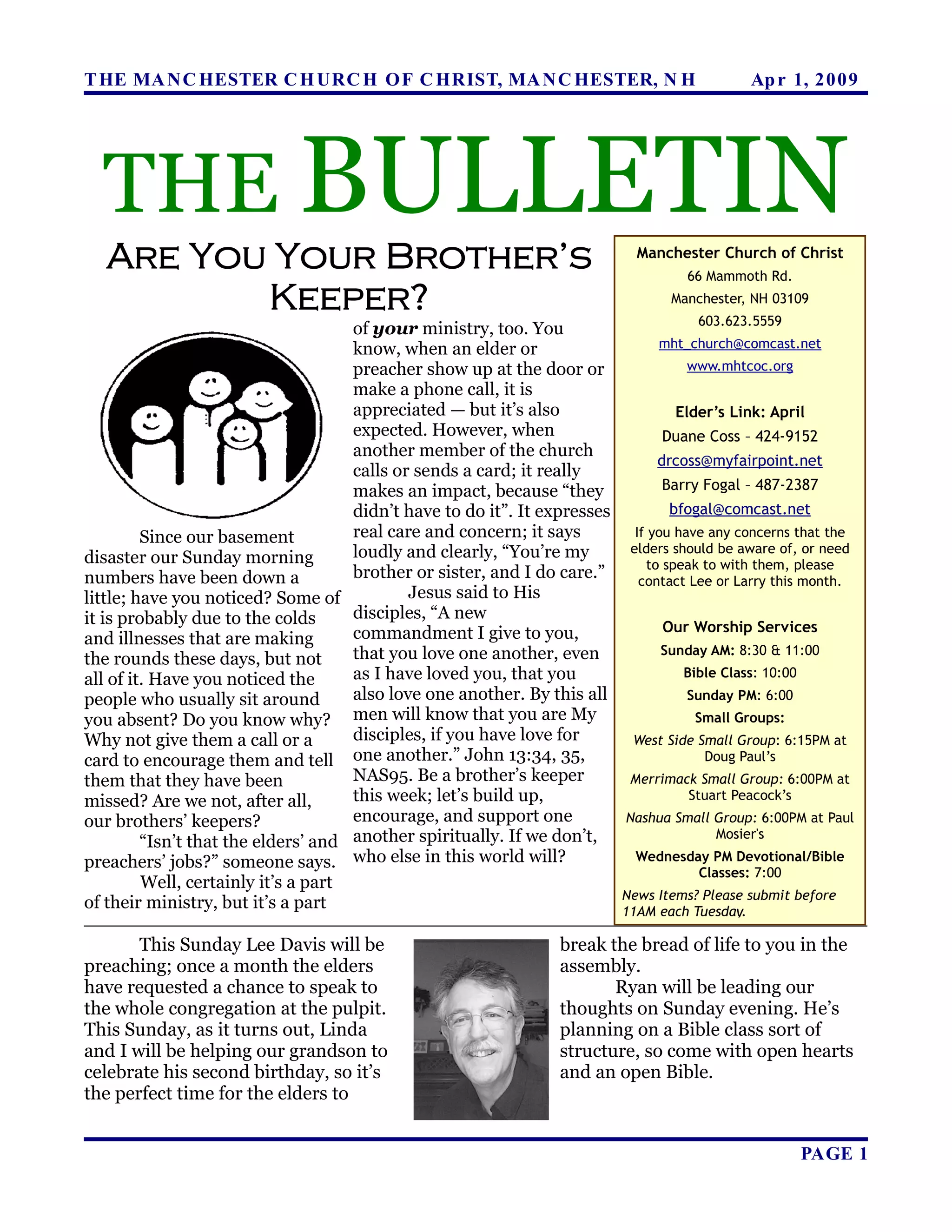 The bulletin from the Manchester Church of Christ provides information on upcoming events including Elder Lee Davis giving the Sunday sermon on avoiding distractions, needs for volunteers, and prayer concerns. It also includes the weekly schedule, birthdays and anniversaries, statistics from last week's attendance and contributions, and an article on the resurrection body after death.