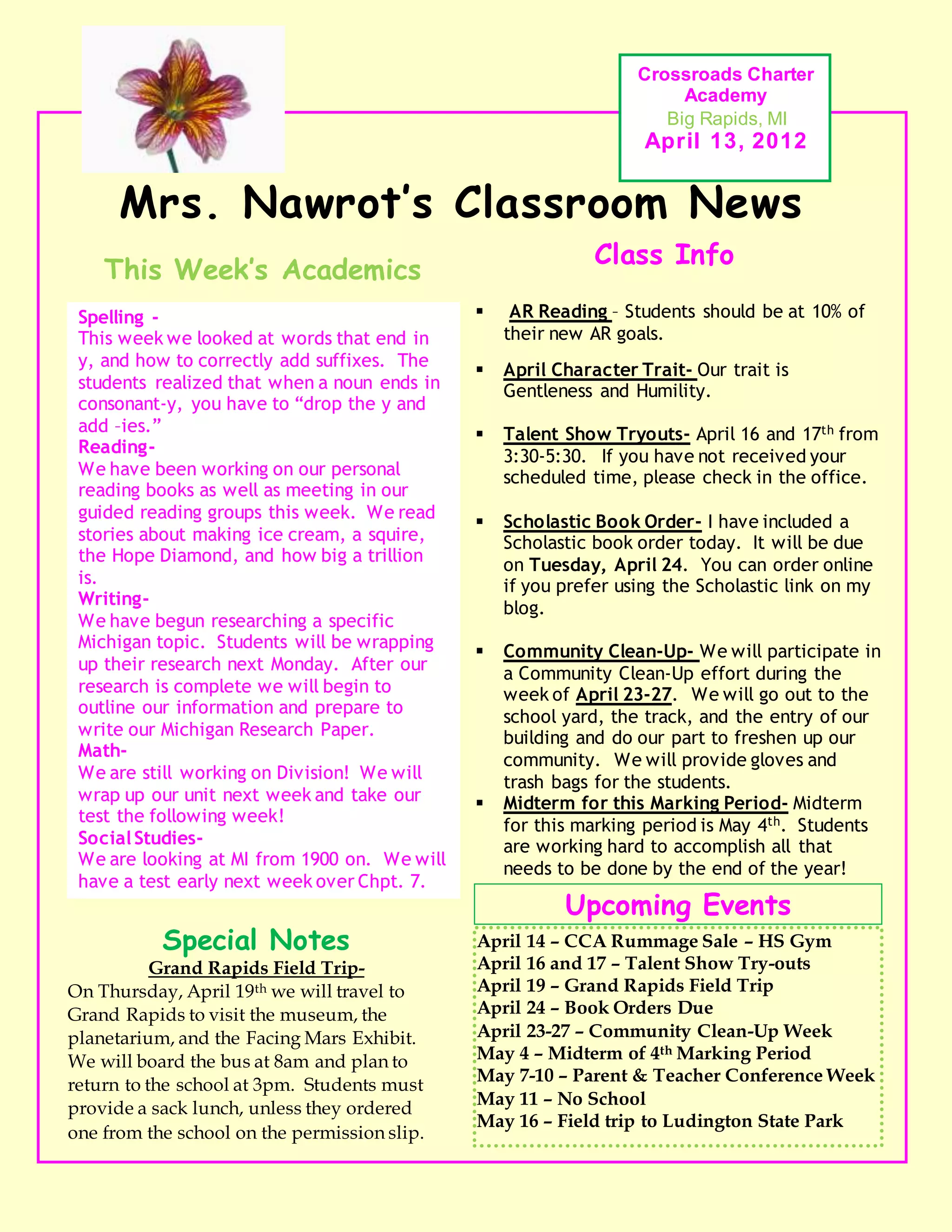 The document provides information about upcoming events and classroom updates from Mrs. Nawrot's class at Crossroads Charter Academy in Big Rapids, Michigan. It lists several field trips and activities happening in April, including a rummage sale, talent show tryouts, a trip to Grand Rapids, and a community clean-up week. It also provides updates on classroom academics like AR reading goals, spelling lessons on words ending in y, guided reading groups, writing research on Michigan topics, and a social studies test on Michigan history from 1900 on.