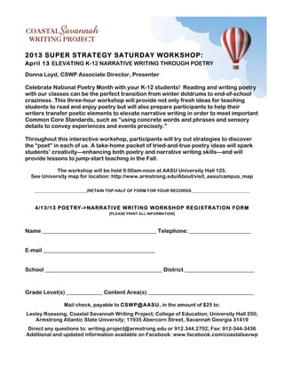 The 2013 Super Strategy Saturday Workshop, held on April 13, focuses on enhancing K-12 narrative writing through poetry, celebrating National Poetry Month. Participants will learn effective strategies for teaching poetry and integrating its elements to improve narrative writing, in line with Common Core standards. The interactive session includes hands-on activities and a take-home packet with resources for future teaching, scheduled from 9:00 AM to noon at AASU University Hall.