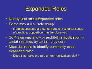 The document discusses expanded roles in emergency medical services, highlighting non-typical roles and the complexity of their implementation within existing legal frameworks. It identifies various examples of expanded roles, such as technicians and practitioners in diverse settings, and addresses the need for appropriate training, certification, and governance. Additionally, it suggests compiling resources and creating matrices to better define and support these roles in the workforce.
