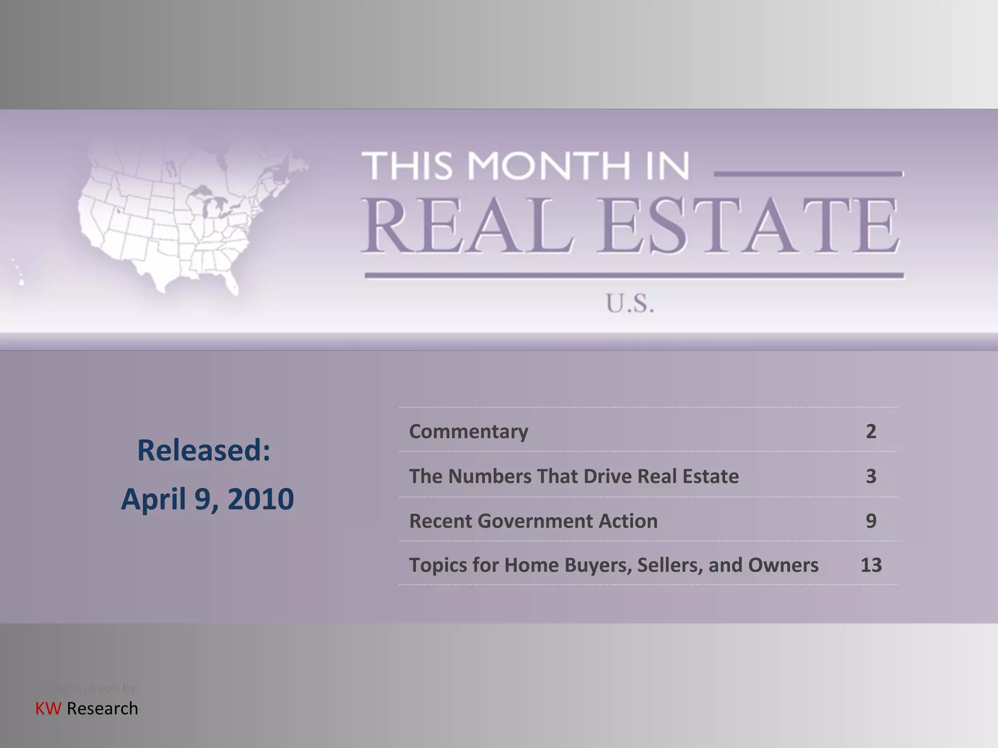 The document summarizes recent economic and real estate market trends. It discusses steps the government has taken to boost the economy through unemployment assistance and mortgage relief programs. Real estate indicators like home sales, prices, inventory and mortgage rates are also summarized. The document concludes with tips for home energy efficiency tax credits.