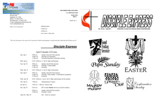 The document is a newsletter from the Oakland United Methodist Church located in Oakland, Iowa. It provides information about upcoming events in April at the church, including Sunday services, youth group meetings, and a prayer vigil. It also includes minutes from the church's Administrative Board meeting which discuss staffing, fundraising, and community outreach projects.