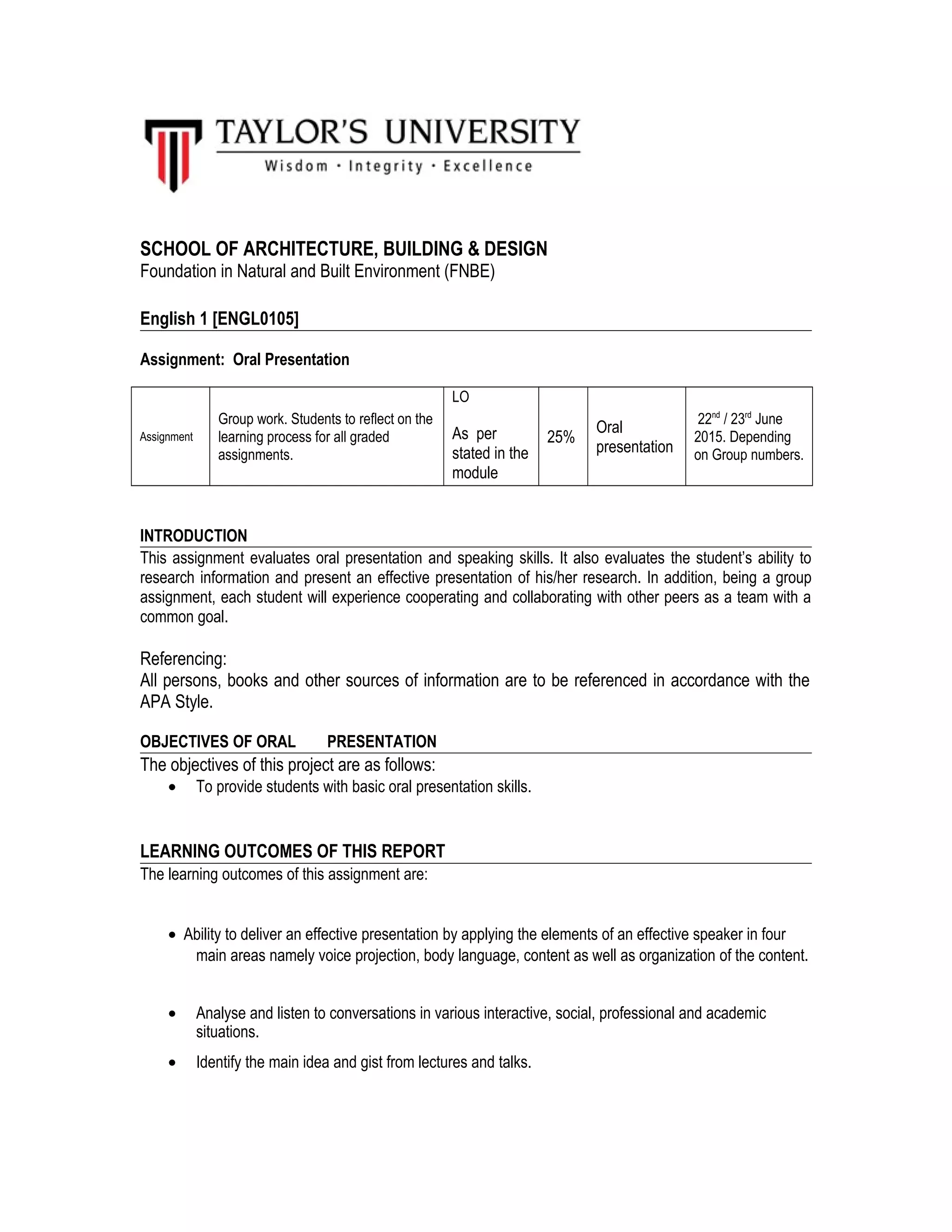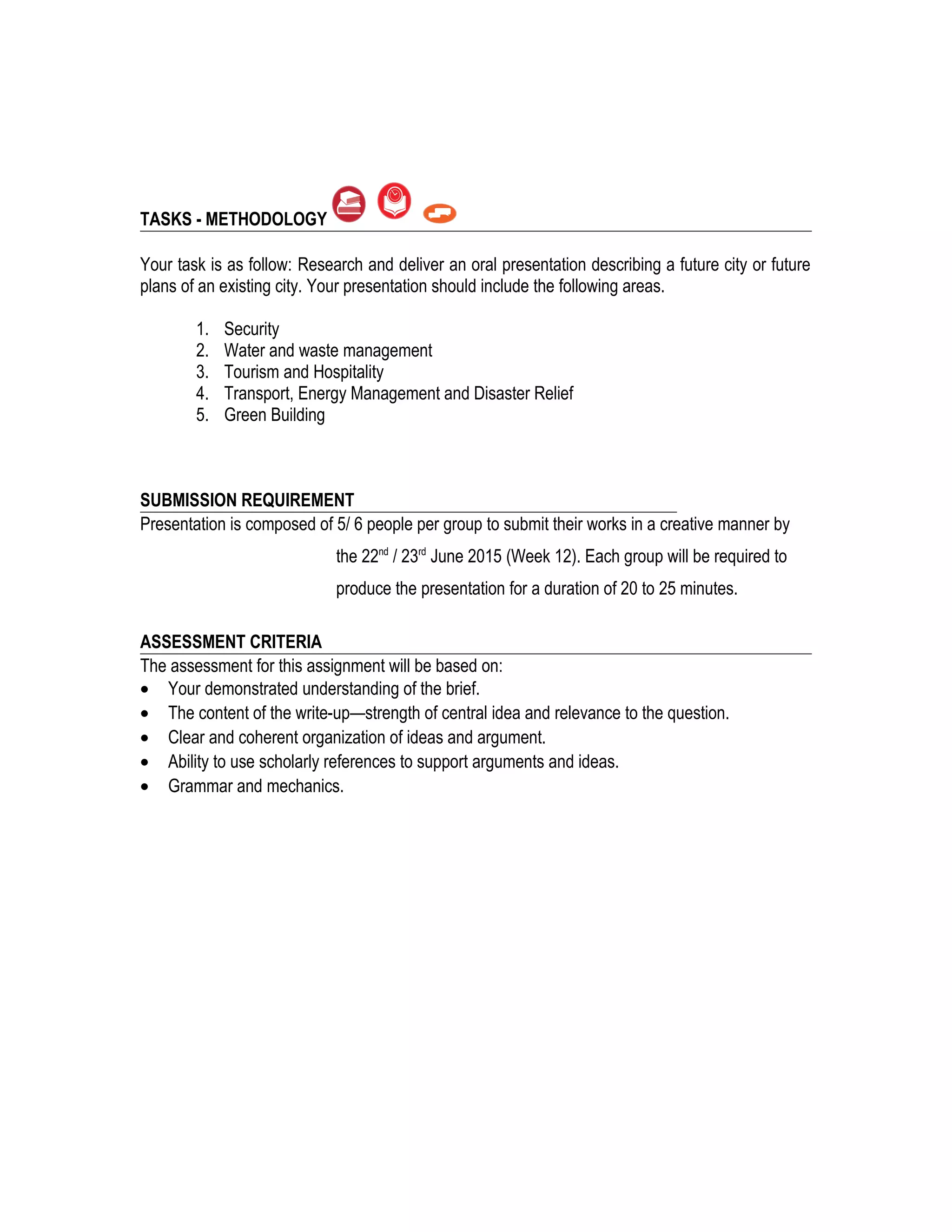 This document outlines an oral presentation assignment for a group of students. It includes instructions for researching and presenting on the topic of a future city or future plans for an existing city. Students will be assessed based on their understanding of the topic, organization of ideas, use of references, and presentation skills. Groups of 5-6 students must submit their 20-25 minute presentations by June 22nd-23rd, 2015. The objectives are to provide students with oral presentation skills and experience cooperating in a team.