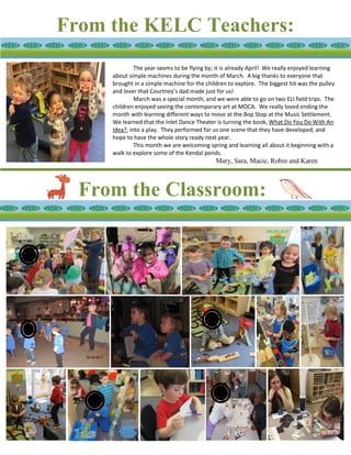 This newsletter provides information about upcoming April events at the Kendal Intergenerational Learning Center (KELC), including an Easter egg hunt, celebrating the Week of the Young Child, and preparing for May conferences. It also notes that the director, Jeni Hoover, will be away for training towards the end of the month. The newsletter lists swimming dates and library visits in April and reminds parents to send children with towels. It provides the 2017 closure dates for KELC and asks parents to turn off their cars when dropping off or picking up. The newsletter discusses continuing a recycling project and invites parents to a singing celebration on April 20th. It notes that KELC will have its first silent auction in May and asks for donations