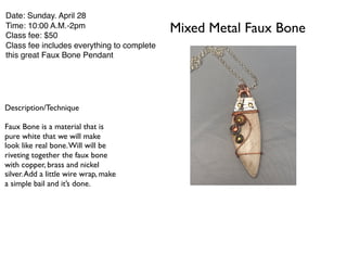This class teaches how to make a faux bone pendant using mixed metals. Students will rivet together faux bone material with copper, brass, and nickel silver to create the look of real bone. For a $50 fee, students will receive all materials needed to complete the project, including learning how to add wire wrapping and a simple bail to finish the pendant.