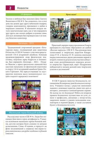 Документ представляет собой выпуск школьного издания, в котором описываются события и мероприятия, происходящие в средней школе №9 города Лиды в апреле 2021 года. Включает информацию о военно-патриотической декаде, спортивных праздниках, праздниках, посвящённых Международному женскому дню и Дню святого Валентина, а также о безопасности в интернете. Также отмечены успехи учащихся в конкурсах и олимпиадах.