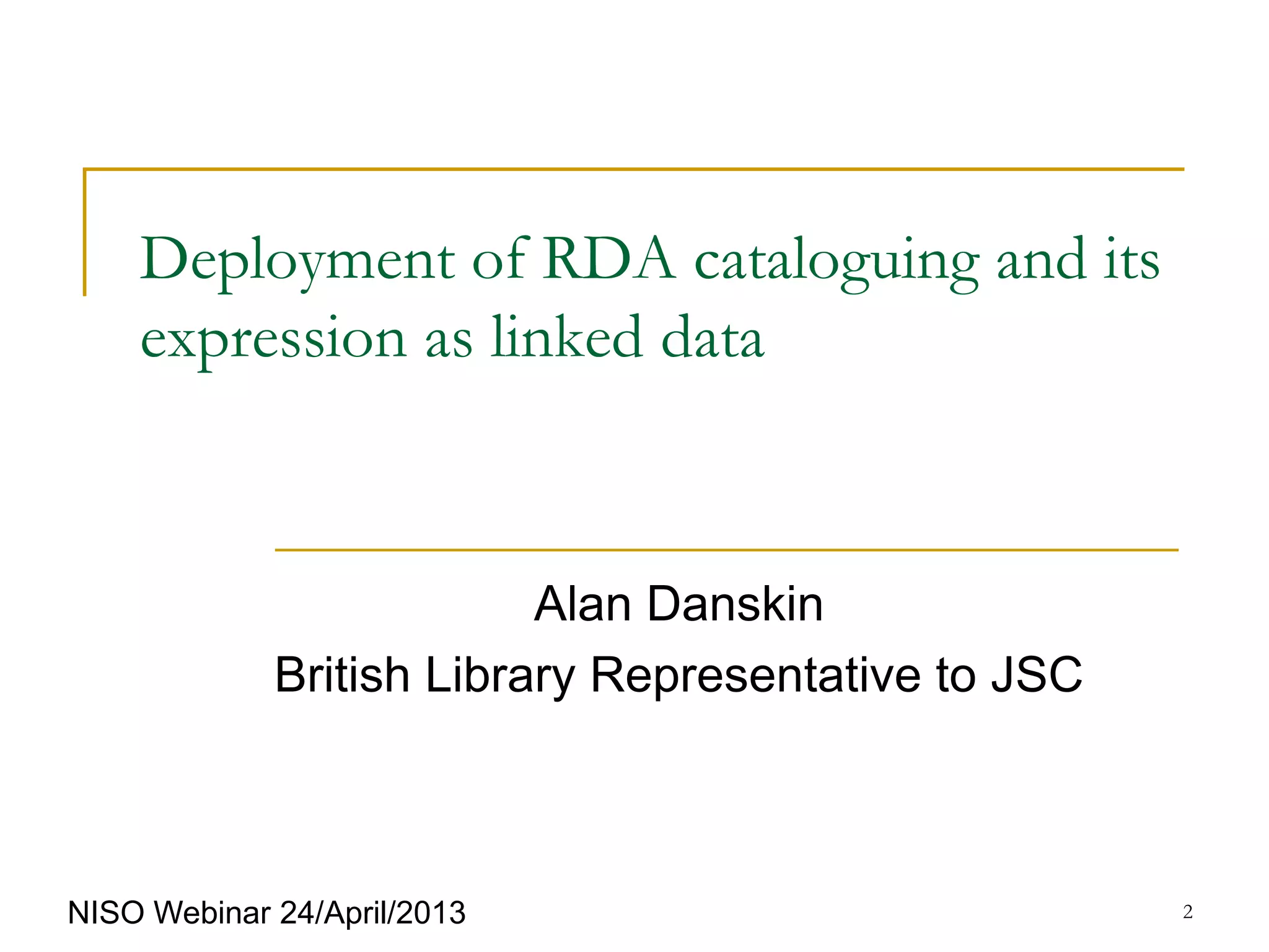 This document summarizes a webinar on deploying Resource Description and Access (RDA) cataloging and expressing it as linked data. The webinar speaker, Alan Danskin from the British Library, discussed RDA as a cataloging standard that provides guidelines for describing resources to support discovery. He explained how RDA works with linked data by using entities, relationships, and attributes expressed as URIs. Challenges in applying RDA as linked data include the complexity of the FRBR model and publishing RDA vocabularies as linked open data. Application profiles help apply RDA by defining the metadata elements, policies, and guidelines for a specific domain or community.