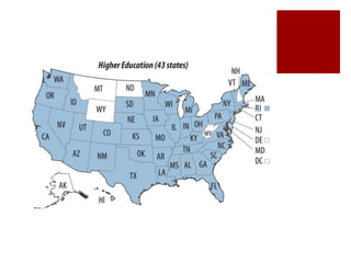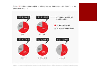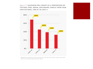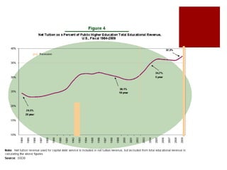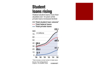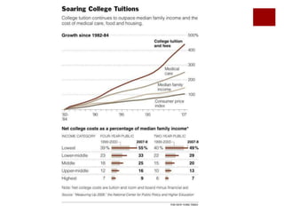 The rising costs of higher education are due to decreased public funding, corporatization of universities, and increased access to student loans. Decreased state and federal support has shifted costs to students, leading universities to pursue profits. Meanwhile, expanding loan programs have allowed tuition to rise rapidly without discouraging enrollment. This has created a student debt bubble as graduates struggle under the weight of loans in a difficult job market. Reformers argue for more public funding of education and mechanisms to relieve student debt, while critics maintain students should pay their own way through competitive private markets.