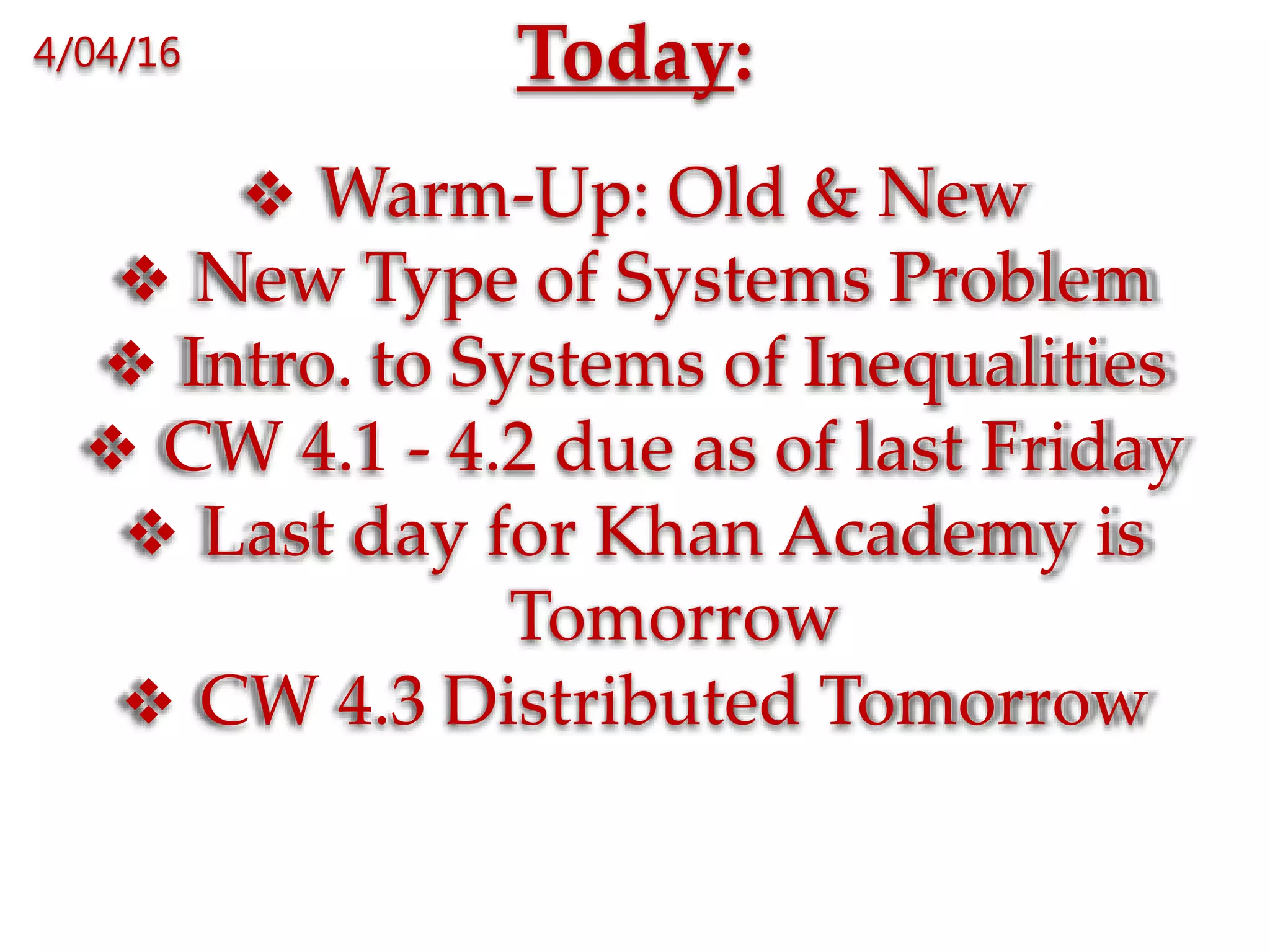 This document contains a daily agenda and warm-up problems for math class including: