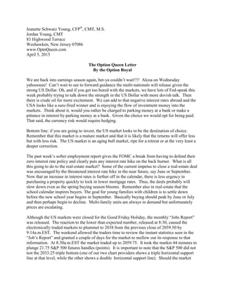 The document discusses current market conditions, emphasizing the upcoming earnings season and the impact of the strong US dollar on investments. It also highlights a softer employment report and its implications for interest rate hikes, suggesting that the real estate market may see slower deals as urgency decreases. Concerns about market corrections persist, particularly in light of recent index performances and commodity trading fluctuations.