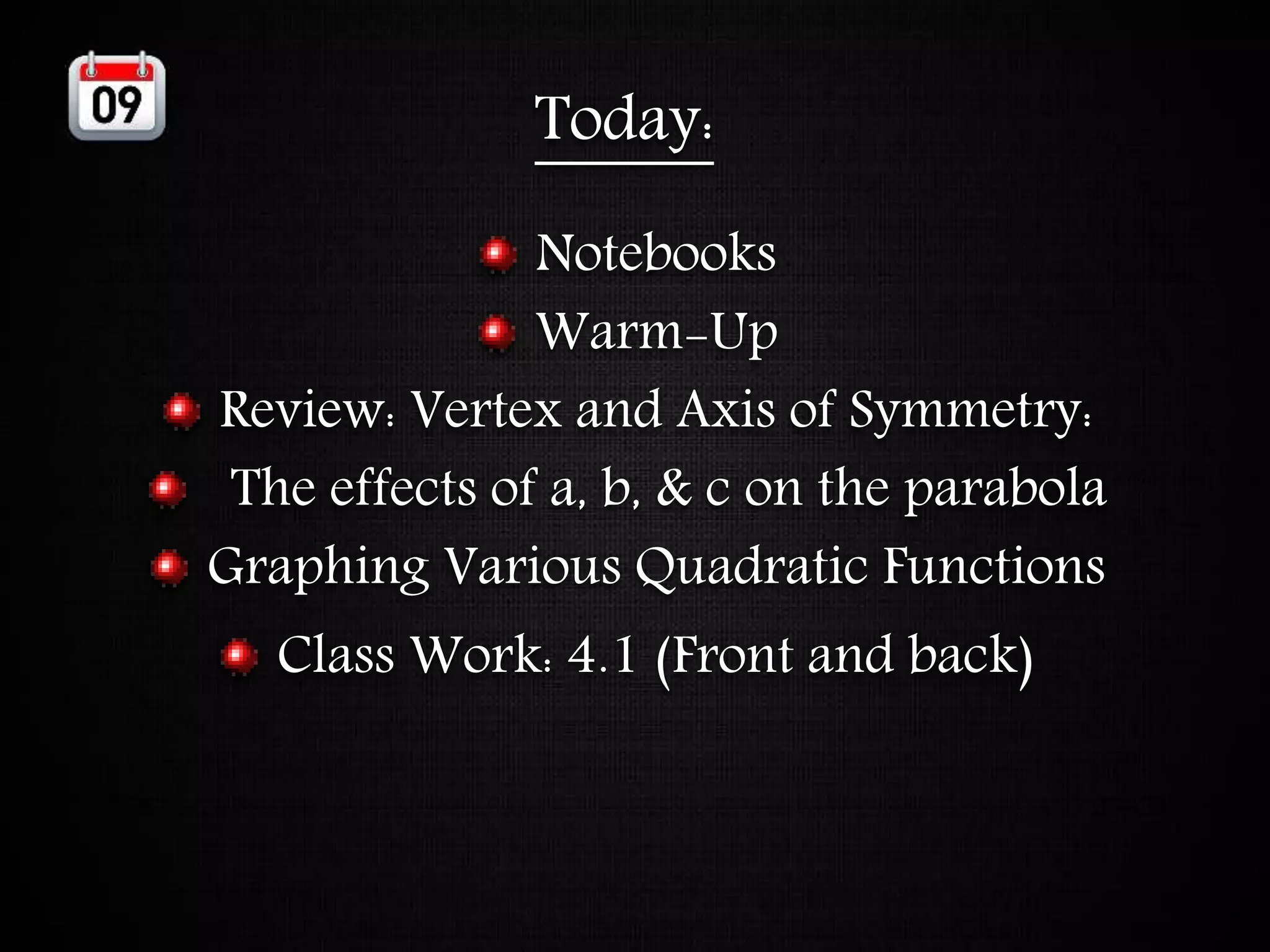 The document discusses graphing quadratic functions. It begins with reviewing key concepts like the vertex and axis of symmetry and how the a, b, and c coefficients affect the graph. Examples are provided for determining the width, direction opened, and vertical shift based on these coefficients. The remainder of the document provides step-by-step examples of graphing quadratic functions by finding the axis of symmetry, vertex, y-intercept, and other points to plot the parabolic curve.