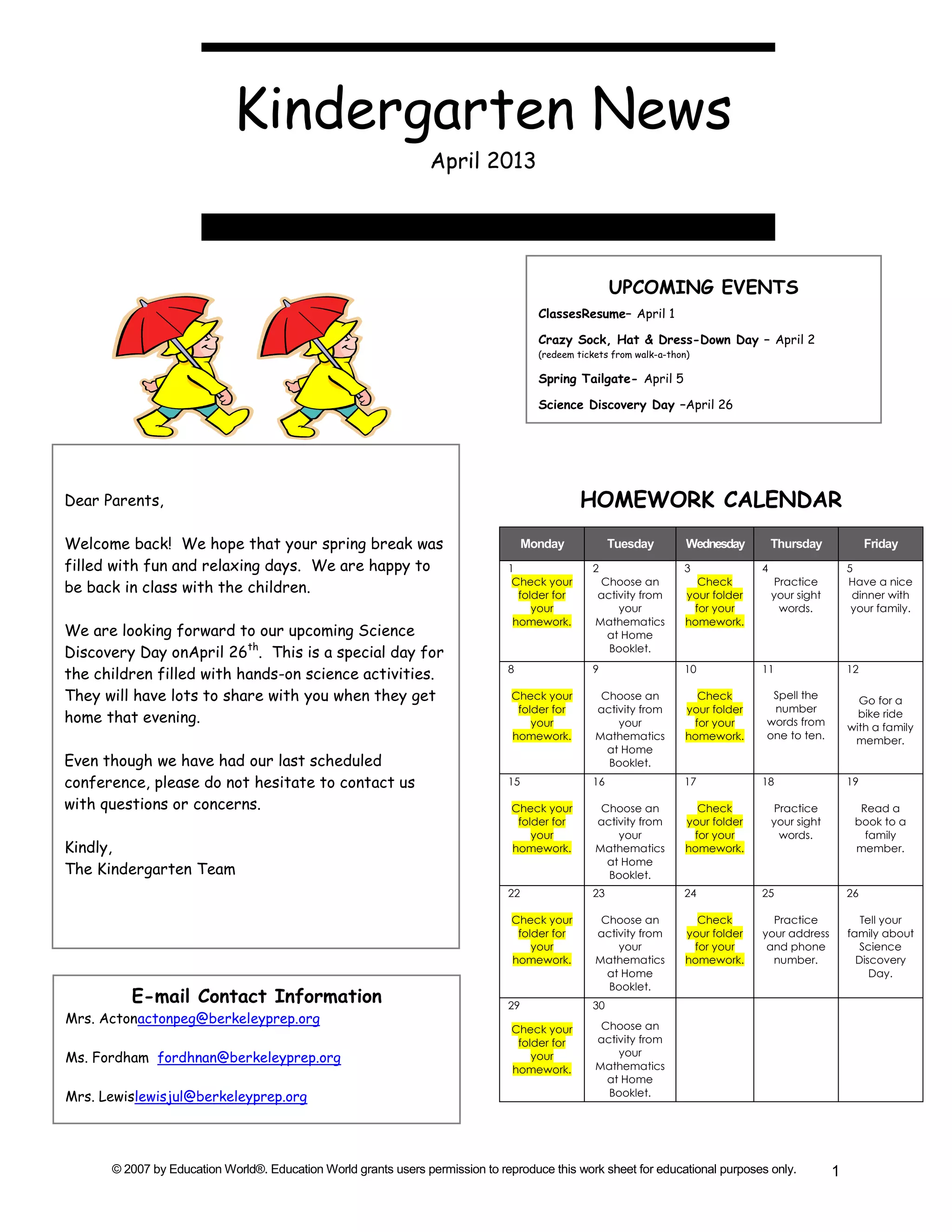 Kindergarten News April 2013 UPCOMING EVENTS ClassesResume– April 1 Crazy Sock, Hat & Dress-Down Day – April 2 (redeem tickets from walk-a-thon) Spring Tailgate- April 5 Science Discovery Day –April 26 Dear Parents, HOMEWORK CALENDAR Welcome back! We hope that your spring break was Monday Tuesday Wednesday Thursday Friday filled with fun and relaxing days. We are happy to 1 2 3 4 5 Check your Choose an Check Practice Have a nice be back in class with the children. folder for activity from your folder your sight dinner with your your for your words. your family. homework. Mathematics homework. We are looking forward to our upcoming Science at Home Discovery Day onApril 26th. This is a special day for Booklet. the children filled with hands-on science activities. 8 9 10 11 12 They will have lots to share with you when they get Check your Choose an Check Spell the Go for a folder for activity from your folder number home that evening. your your for your words from bike ride with a family homework. Mathematics homework. one to ten. member. at Home Even though we have had our last scheduled Booklet. conference, please do not hesitate to contact us 15 16 17 18 19 with questions or concerns. Check your Choose an Check Practice Read a folder for activity from your folder your sight book to a your your for your words. family Kindly, homework. Mathematics homework. member. at Home The Kindergarten Team Booklet. 22 23 24 25 26 Check your Choose an Check Practice Tell your folder for activity from your folder your address family about your your for your and phone Science homework. Mathematics homework. number. Discovery at Home Day. Booklet. E-mail Contact Information 29 30 Mrs. Actonactonpeg@berkeleyprep.org Choose an Check your folder for activity from your Ms. Fordham fordhnan@berkeleyprep.org your homework. Mathematics at Home Mrs. Lewislewisjul@berkeleyprep.org Booklet. © 2007 by Education World®. Education World grants users permission to reproduce this work sheet for educational purposes only. 1