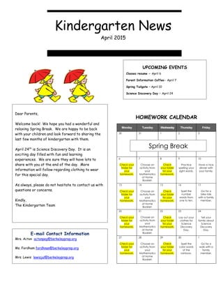 The kindergarten teachers welcome the students and parents back from spring break. They look forward to sharing the last few months of the school year with the students. An upcoming event is Science Discovery Day on April 24th, which will be an exciting day of learning experiences. Parents will receive more information about appropriate clothing for this special day. The teachers encourage parents to contact them with any questions or concerns.