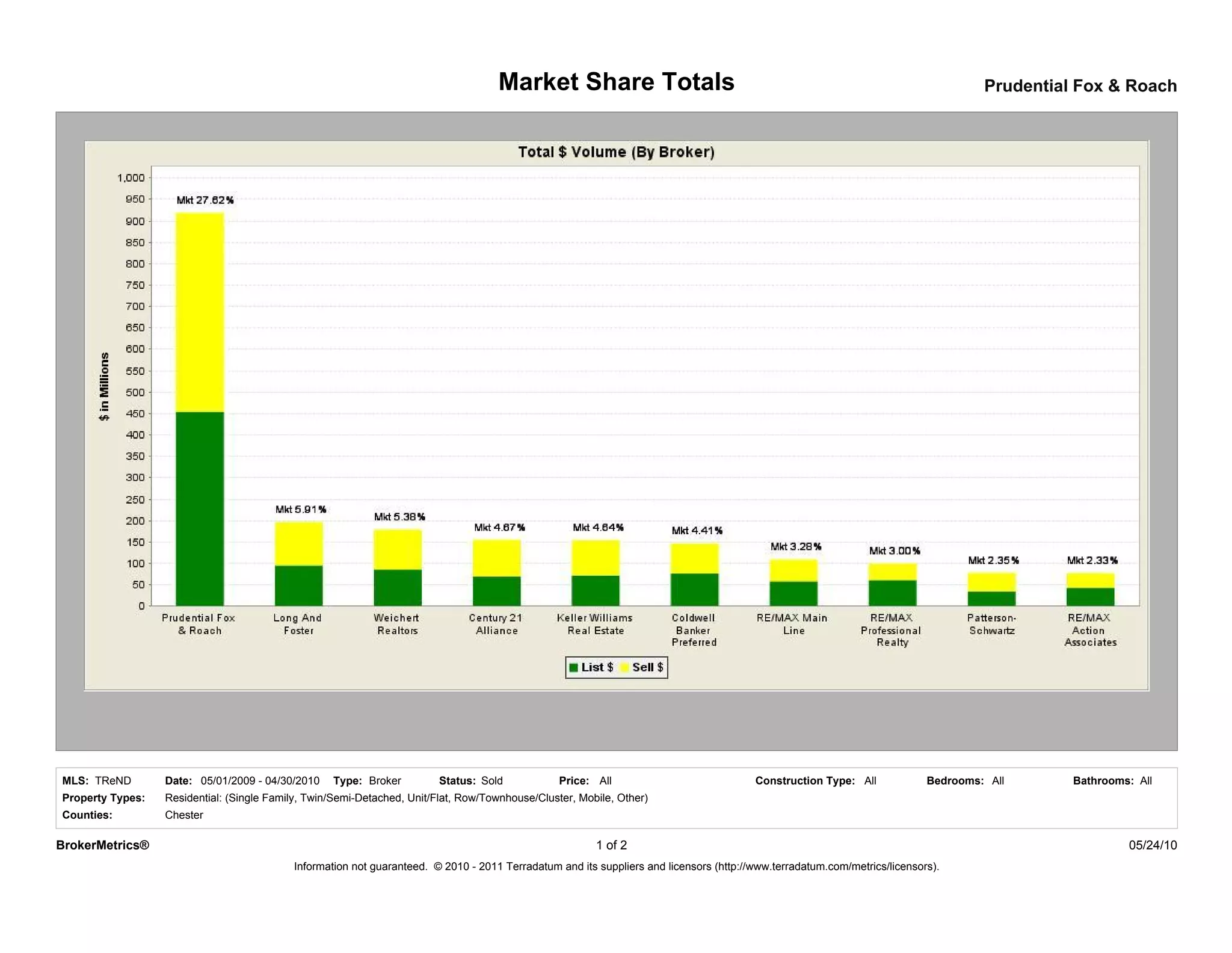 Prudential Fox & Roach had the largest market share of residential real estate sales in Chester County from May 2009 to April 2010, with 27.62% of the total sales volume. They sold 1,149 homes for a total of $464,043,220. Prudential Fox & Roach had 1,735 agents working across their 32 offices.
