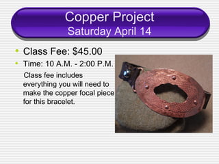 The document lists details for several jewelry making classes taking place in April, including class fees and materials needed. The April 7th wire wrapping class costs $25 and teaches how to make earrings or pendants out of wire. The April 14th copper project class costs $45 and includes all materials needed to make a copper bracelet focal piece. The April 21st mother's china class costs $20 and teaches how to incorporate china pieces and beads into sterling silver bezels.