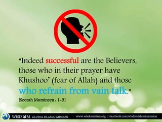 This document discusses the Islamic prohibition of lying. It provides numerous quotes from the Quran and hadiths that warn against lying and describe it as sinful. The document notes that lying is only permissible in rare circumstances like reconciling disputes or during wartime. Overall, the document emphasizes that Muslims must always speak the truth and avoid false statements or idle talk.