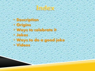 April Fool's Day is celebrated in many countries on April 1st by playing jokes and laughing. The tradition began in the 16th century when Pope Gregory XIII changed the calendar, moving New Year's Day from April 1st to January 1st. Now people celebrate by playing simple jokes on each other. Good jokes involve silence, discretion, having a funny joke prepared, and delivering it quickly. Some example YouTube videos about cars, police, and the history of April Fool's Day are also provided.