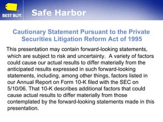 This document provides an investor presentation for Best Buy Co., Inc. from April 2007. It summarizes Best Buy's market share and growth in the United States and Canada. Best Buy has achieved 20% market share in the US and over 30% in Canada. The presentation outlines Best Buy's strategies for continued growth, including expanding its store base, developing new store formats, growing private label offerings, and expanding services. It also discusses Best Buy's international expansion into China and plans to test new markets in Mexico and Turkey.