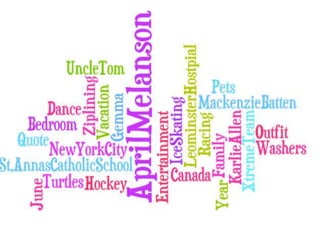 April Melanson is a 13-year-old girl from Massachusetts who enjoys dancing, spending time with friends and family, and traveling. She has been dancing since age 4 and has won national competitions. She lives with her mother and brother and has an extended family that she enjoys visiting in Canada annually.