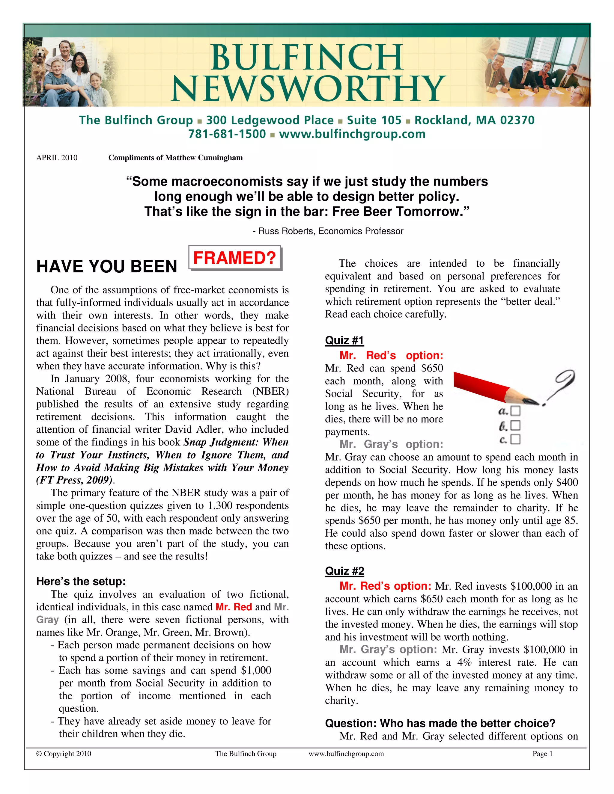 This document summarizes a study on how retirement choices are framed and how framing influences decisions. It discusses two fictional retirement scenarios ("Mr. Red" and "Mr. Gray") that were presented to respondents in different frames. Though the options were the same, more chose Mr. Red's option when framed as spending and Mr. Gray's option when framed as investing. The document argues that framing significantly impacts financial decisions and that a consumption frame may be more beneficial. It also discusses how lifetime annuities are positively framed by economists but negatively by some due to concerns about unused principal.