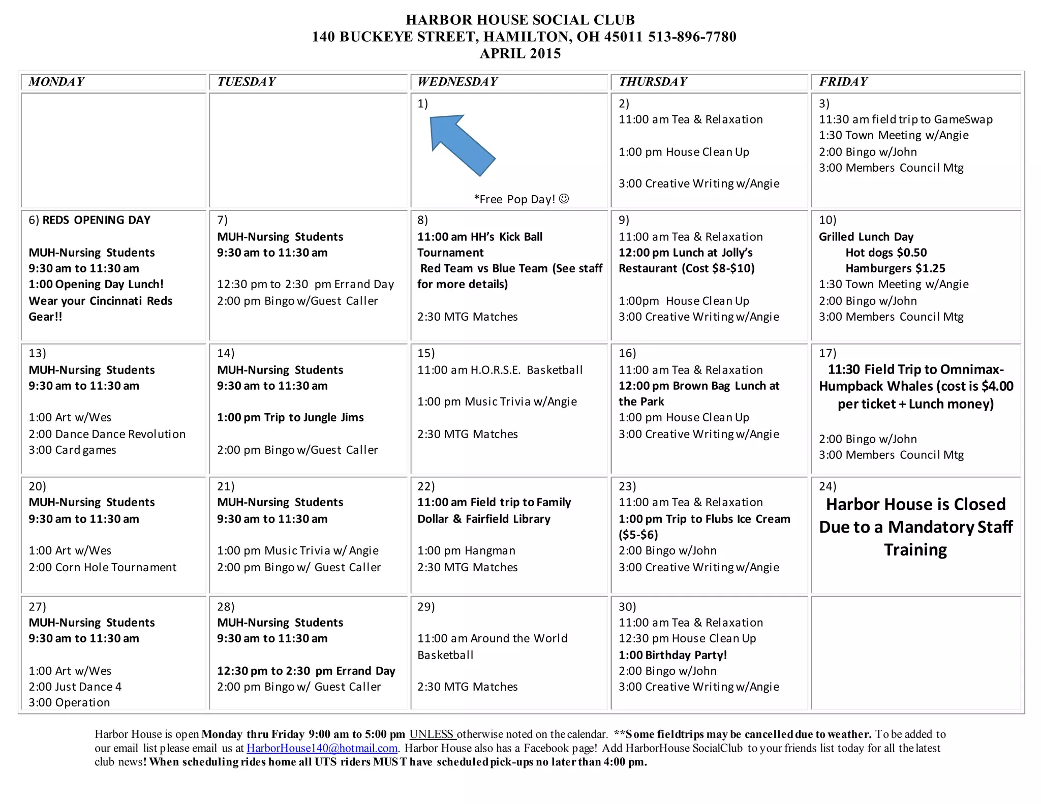 This document provides the April 2015 calendar for Harbor House Social Club located in Hamilton, OH. It lists the daily activities, events, and field trips scheduled between Monday, April 1st and Friday, April 30th. Most days include activities like bingo, creative writing, relaxation time, and outings to local businesses. Notable events include Opening Day for the Cincinnati Reds on April 6th, a kickball tournament on April 8th, and a birthday party on April 30th. The club is open Monday through Friday from 9 am to 5 pm, unless otherwise noted, and all riders of the UTS transportation service must be scheduled for pick-up by 4 pm.