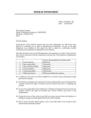 This document is an offer of appointment from AM Group to Ms. Aprilyn G Caguitla for the position of Saleslady. The offer is subject to a satisfactory medical examination and completion of employment visa formalities. It details her salary and benefits which include a basic salary of 720 AED per month, other allowances of 480 AED per month, accommodation of 400 AED per month and medical insurance provided by the company. The contract is for 2 years renewable with a 6 month probation period. Acceptance of the terms and conditions requires Ms. Caguitla's signature and return of the document within 7 days.