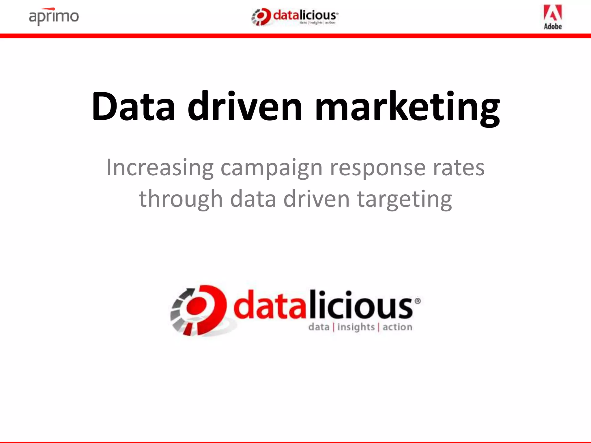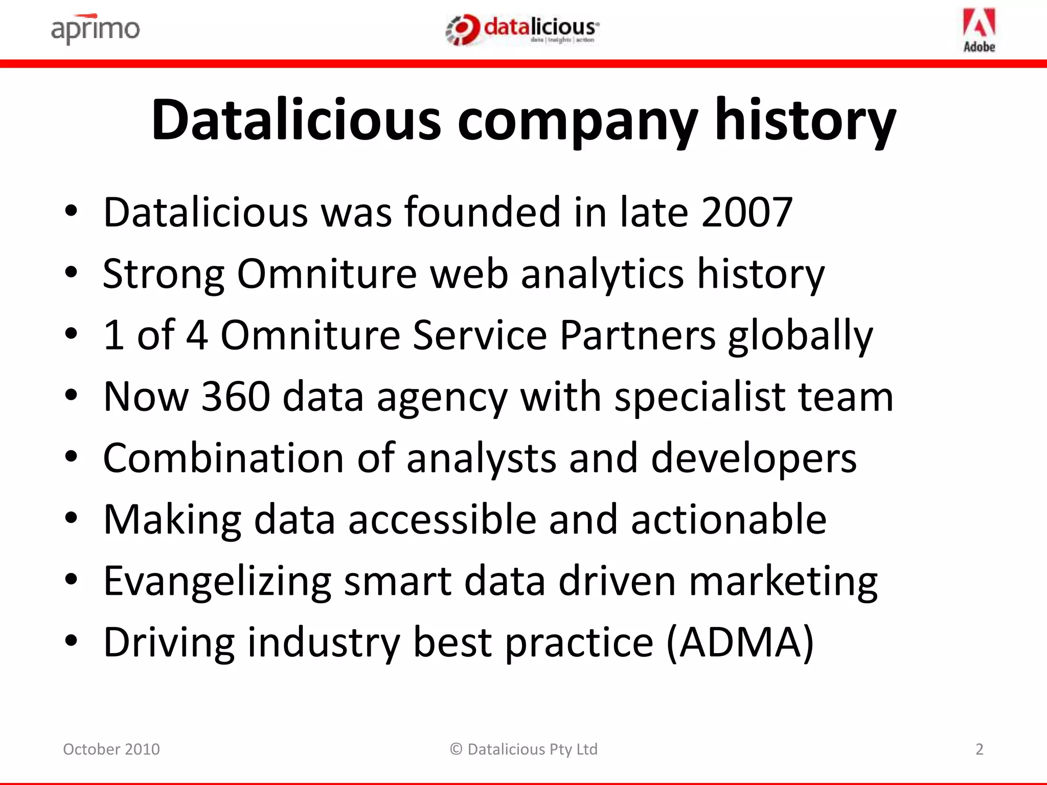 Datalicious is a data analytics company founded in 2007 that helps other companies improve their digital marketing efforts through data-driven targeting and personalization. They analyze customer data from various online and offline sources to develop targeted messaging and content for different customer segments across multiple marketing channels. Their services include improving media attribution, optimizing ad spend, testing variations, and increasing campaign response rates by up to 20% through coordinated multi-channel marketing personalized for each customer.