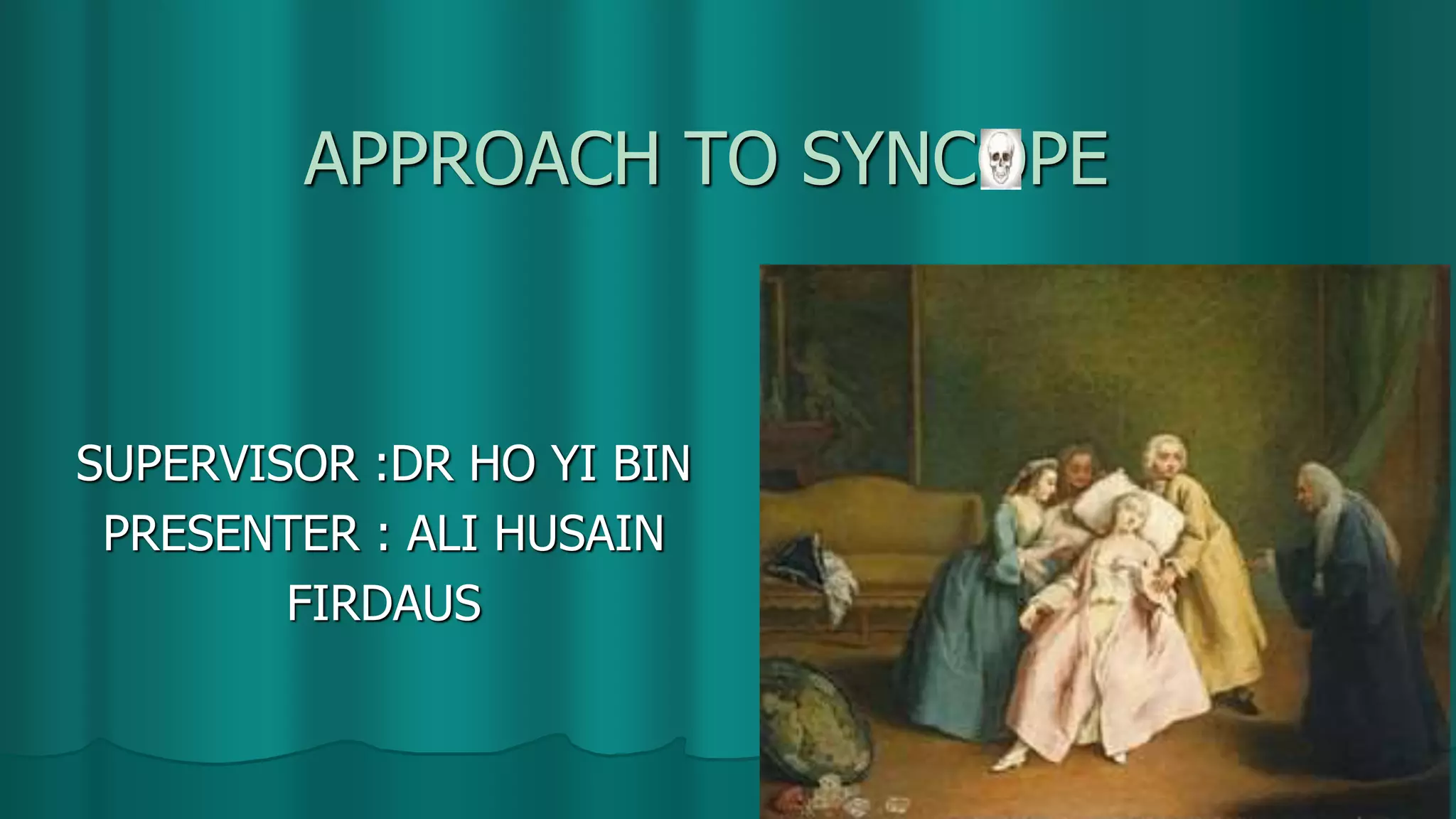 Syncope, or fainting, is caused by insufficient blood flow to the brain. It is usually brief and self-limited. Evaluation of syncope involves obtaining a detailed history, physical exam, ECG, and testing based on risk factors. Causes are categorized as benign if due to things like vasovagal response, or dangerous if due to cardiac arrhythmias. High-risk patients warrant further cardiac workup and monitoring, while low-risk patients can often be evaluated as outpatients.