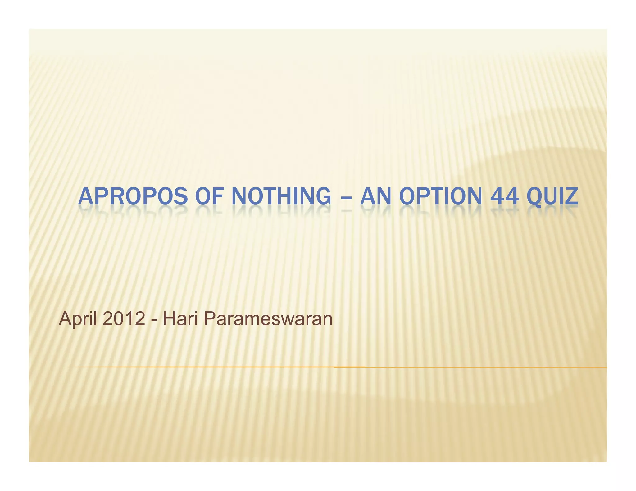 This document provides the rules and questions for a quiz called "Apropos of Nothing - An Option 44 Quiz". It consists of 16 written questions in two parts, with each question worth points based on how many teams answer correctly. There are also 40 main round questions. The first written question asks for the common name of the European viper. Subsequent questions provide passages of text and ask for identifications, names, or other short answers.