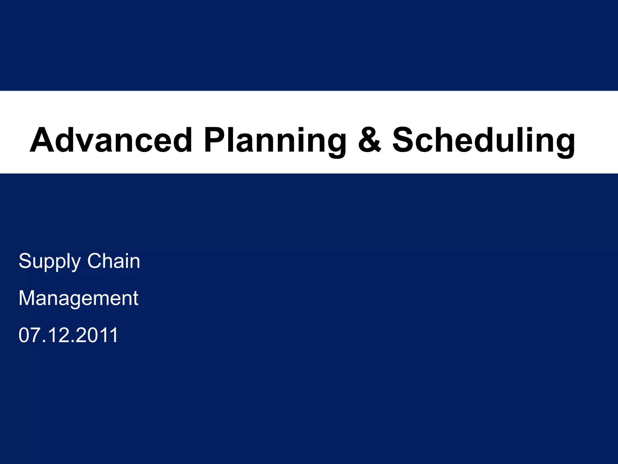 This document discusses Advanced Planning & Scheduling (APS) systems. It begins with an introduction to supply chain planning and the problems traditional systems encounter with demand fluctuations and inventory management. It then outlines the development of earlier SCM IT systems like MRP, MRPII, and ERP. APS systems aim to resolve issues with these prior systems by improving integration across the entire supply chain and enabling optimization of production planning. The document provides examples of APS vendors and modules. It also focuses on how APS benefits the pharmaceutical industry through collaborative planning, improved capacity utilization, and data consolidation across manufacturing sites. Overall, APS allows for more flexible and responsive planning in complex supply chain environments.