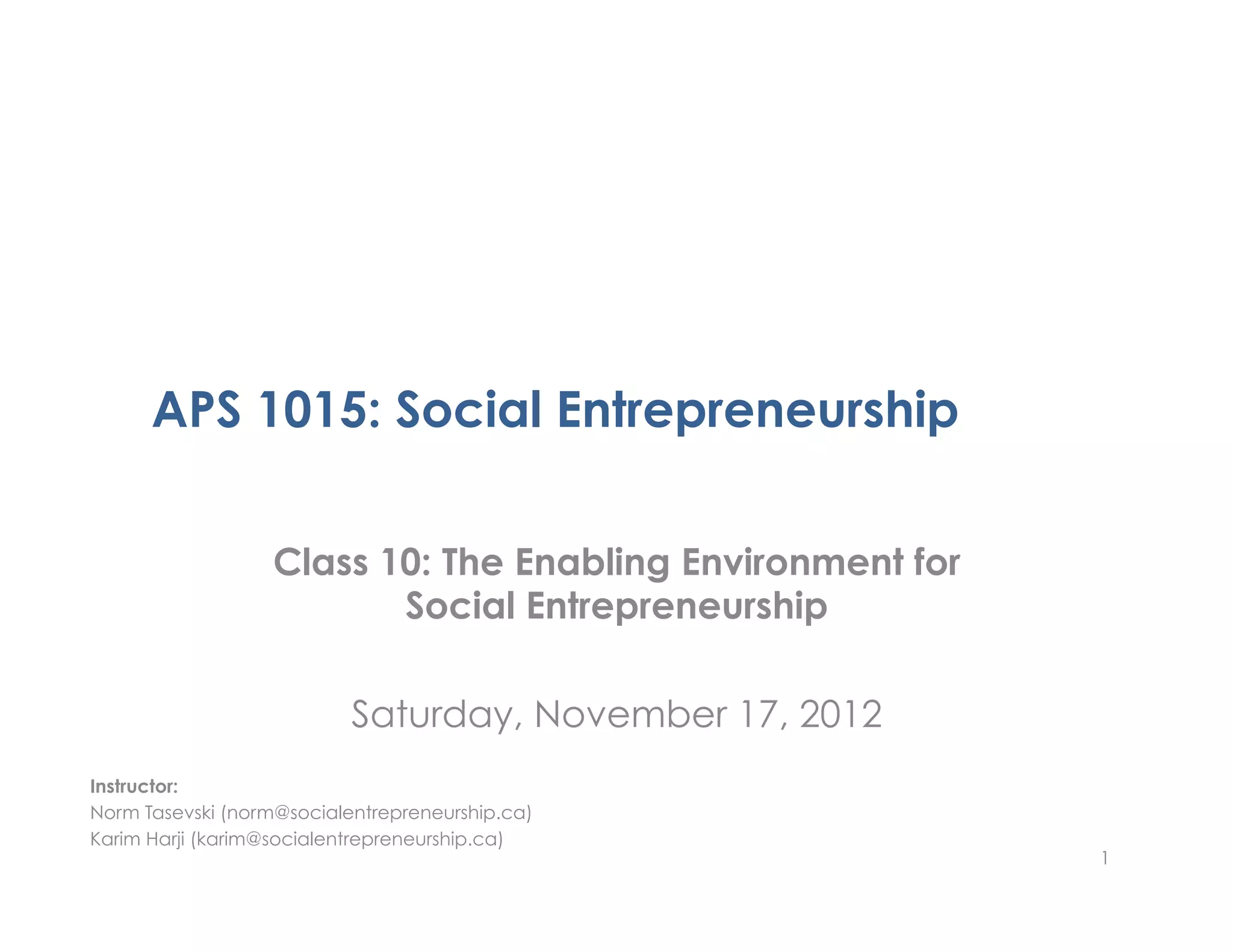 The document provides an agenda for a social entrepreneurship class. It discusses upcoming student investment pitches, guidelines for the pitches, and advice for creating effective pitches. It also covers the evolving enabling environment for social entrepreneurship, including the growing ecosystem and types of support available. The document concludes with a review of key course concepts and a preview of the following class, which will involve dry run practice pitches by students.