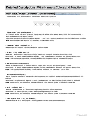 - Descriptions of the wire harness colors and functions, including connections for door locks, power, and sensors.