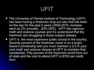 The document describes the APSSP (Argosy Post Secondary Student Support Program) scholarship program at the University of Florida Institute of Technology (UFIT). The program aims to increase UFIT's low freshman retention and graduation rates by providing academic, social, and financial support to low-income incoming freshmen. The support includes tutoring, counseling, housing, meals, and funding to cover tuition and books for the first year or three semesters. The goal is for recipients to develop competence, manage emotions, and gain independence through the program's support structures to help them persist and succeed in their studies.