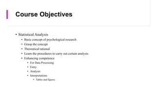 This document provides an overview of a course on data analysis using SPSS. The course objectives are to teach students statistical analysis concepts, grasp psychological research concepts, and learn how to appropriately process, analyze, interpret and report on research data using SPSS. The course will cover introductory topics like launching SPSS and understanding its interface, as well as more advanced topics like conducting different statistical tests and interpreting outputs. Students will apply their learning through a group project involving data collection, analysis and reporting.