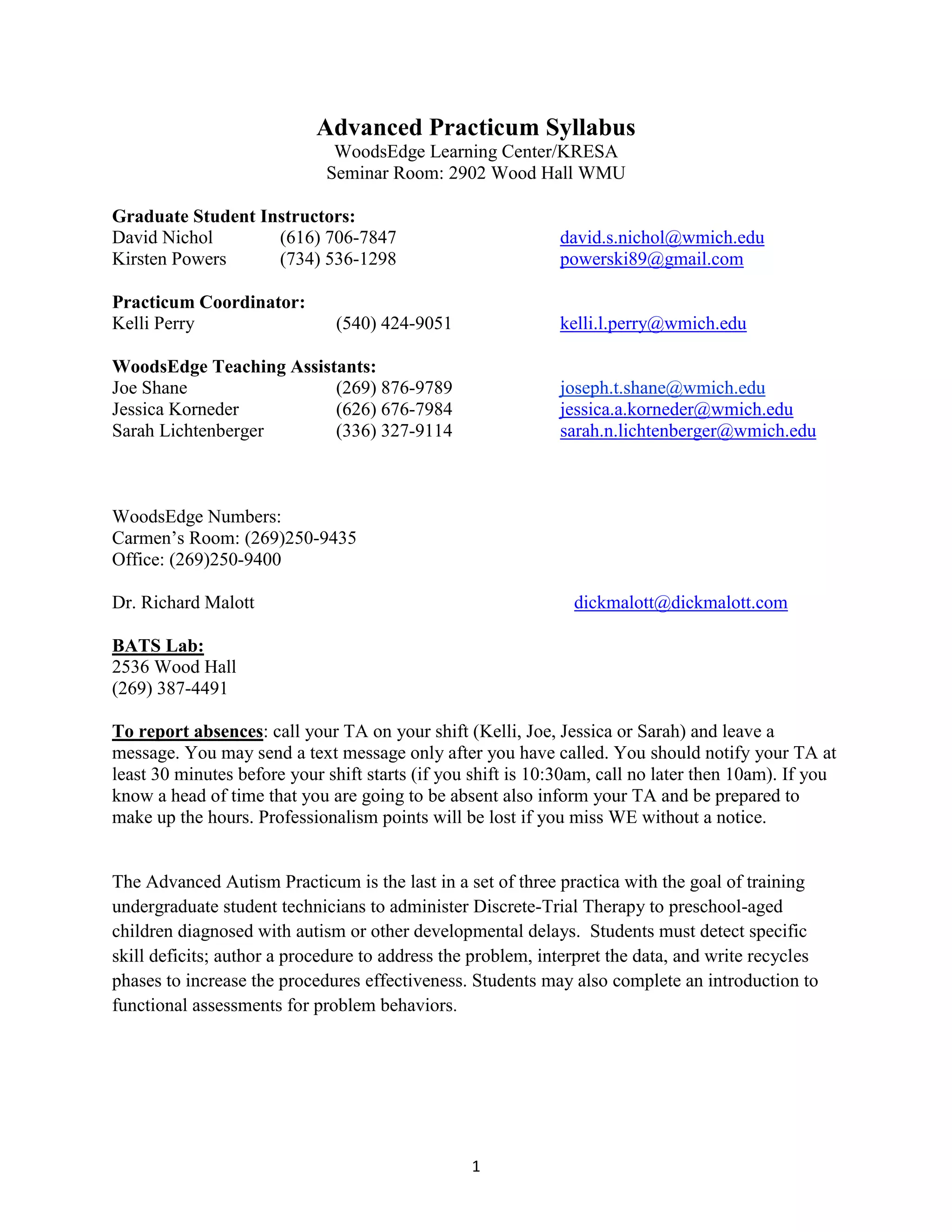 This document provides the syllabus for an Advanced Practicum course at WoodsEdge Learning Center/KRESA. It outlines the roles and responsibilities of practicum students, grading criteria, expectations at WoodsEdge, assignments and deadlines. Students are expected to administer Discrete Trial training to children with autism or developmental delays. They will complete assignments such as a task analysis, preference assessment, writing instructional procedures, functional assessments, and presenting client data. The syllabus emphasizes attendance, professionalism, and following WoodsEdge expectations to provide consistency for clients.
