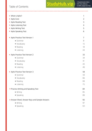 This document provides information about the Aptis English language test, including details of its format and content. It consists of practice tests that simulate the actual Aptis exam. The practice tests cover grammar, vocabulary, reading, and listening skills. They include multiple choice questions, sentence completion tasks, matching definitions to words, and rearranging jumbled sentences into a coherent text. The document aims to familiarize test takers with the Aptis question types and time limits so they can effectively prepare for the official exam.
