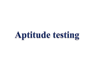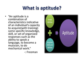 Aptitude tests measure an individual's potential ability and capacity to acquire specific skills or knowledge in various areas such as mechanical, clerical, musical, and graphic arts. These tests assess teachability, special inclinations, and predict success in relevant training or professions. The document discusses various aptitude tests, their reliability, and their role in educational and vocational guidance.
