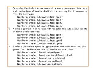 The document discusses problems involving cubes that are painted different colors on their faces and then cut into smaller identical cubes. It provides the answers to questions about counting the number of smaller cubes with a given number of faces of each color. For a cube cut into 216 smaller cubes where 3 pairs of adjacent faces are each painted a single color, there are 72 cubes with no red paint, 44 with at least two colors, 72 with only red or blue, 14 with only red and blue, and 18 with red and blue. For a cube cut into 343 smaller cubes where 3 faces are each a different color, there are 43 painted cubes total, 1 with 3 faces painted, 18 with 2 faces painted, 75 with 1 face painted, and
