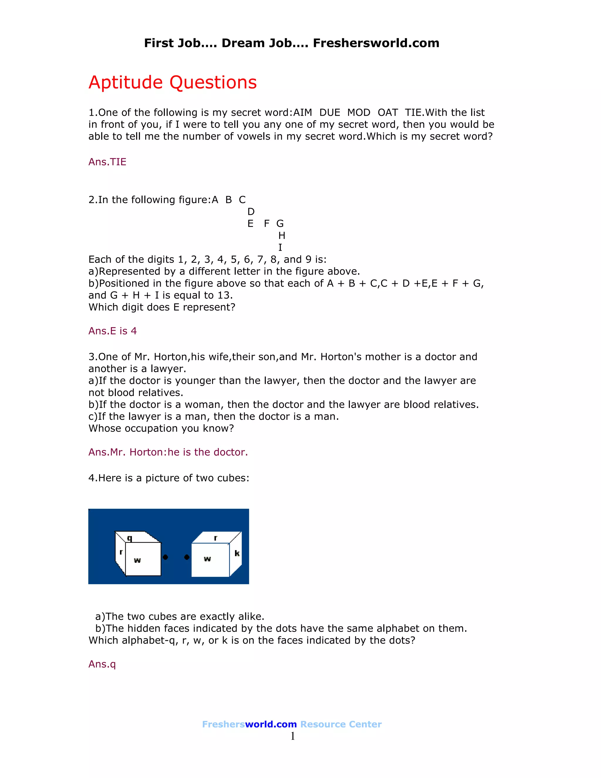 The document contains 3 sample aptitude questions: 1) The secret word is "TIE" as it is the only word with 2 vowels. 2) The question shows a figure with letters representing digits such that the sums of triplets of letters are all 13. This means E must represent 4. 3) The question provides information about the occupations of Mr. Horton, his wife, son, and mother and states conditions relating their ages and genders to their occupations.