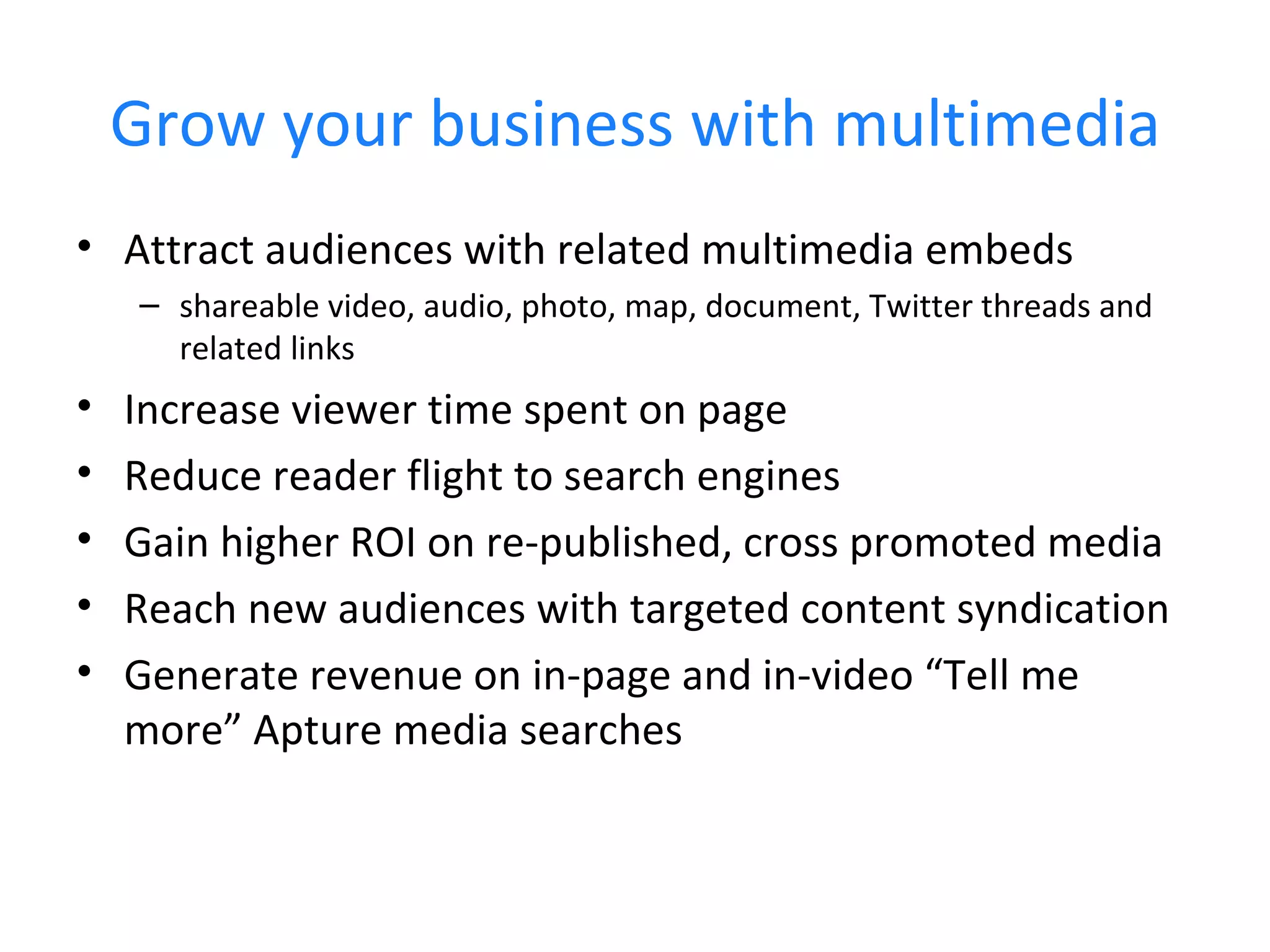 Apture is a multimedia tool that allows users to embed related videos, images, and other media into web pages to keep readers engaged on the site. It increases time on page by 4x and engagement by 5-10% by offering a richer storytelling experience without readers needing to leave the page. Content creators can use Apture to easily find, link, and embed relevant external media or internal content into their writing from a media hub to enhance stories and cross-promote their own content.