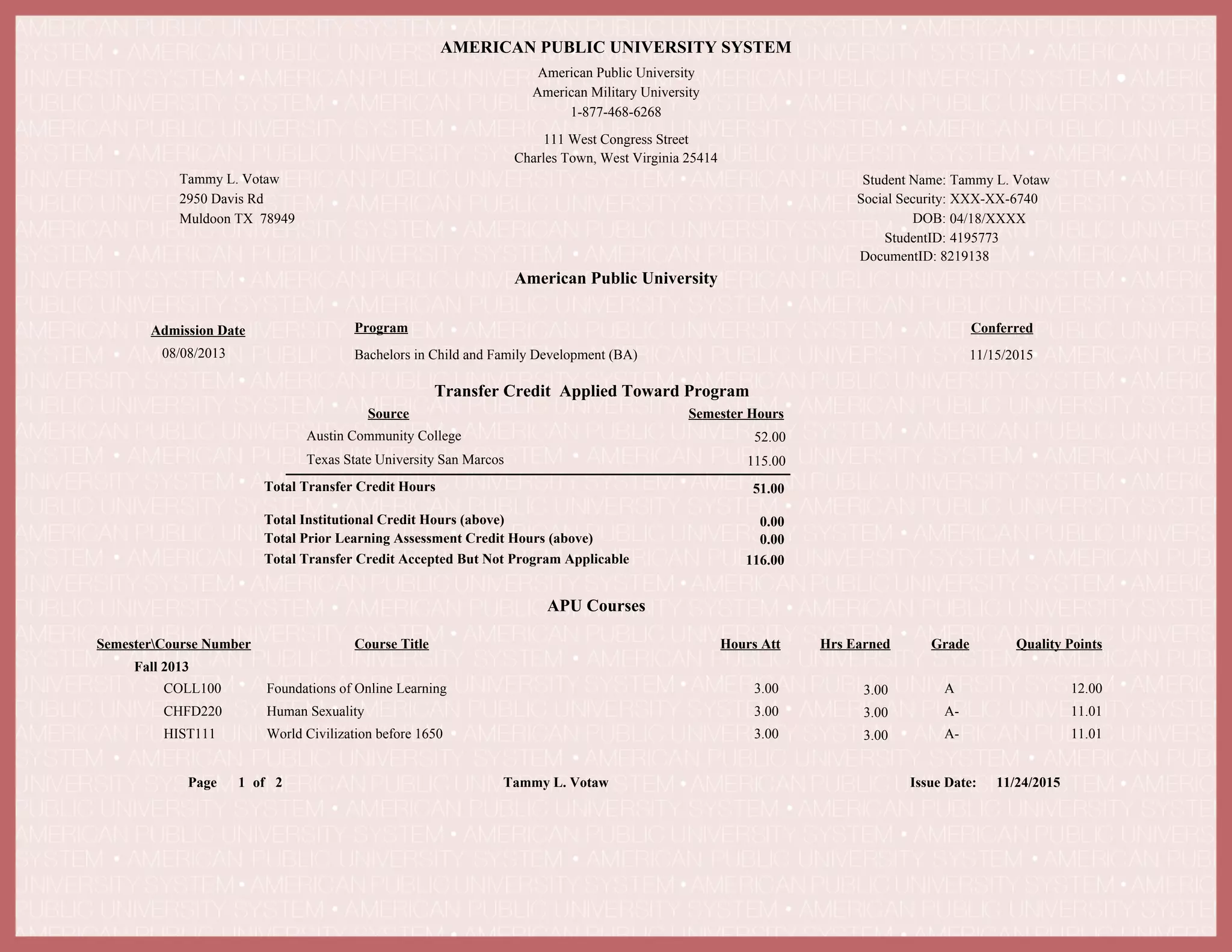 This official transcript from American Public University System documents Tammy Votaw's completion of a Bachelor of Arts in Child and Family Development on November 15, 2015. It shows that she earned 73 credit hours at APUS with a cumulative GPA of 3.5400. A total of 167 transfer credit hours were accepted from Austin Community College and Texas State University San Marcos. The transcript details the courses taken at APUS each semester, grades received, and quality points calculated. It includes information about APUS accreditation and policies regarding official transcripts and grading.