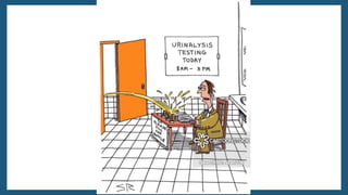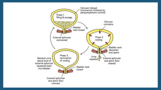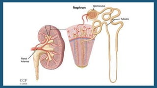 The document provides an overview of the urinary system, including its general functions, major organs, urine formation process, urine composition, micturition, urinalysis, homeostasis, and aging effects. It describes the kidneys' roles in excretion, regulation of blood volume and pressure, electrolyte and pH balance, and hormone release. The major organs - kidneys, ureters, bladder, and urethra - and their structures and functions are defined. Urine formation via nephron filtration, reabsorption and secretion is explained in detail.