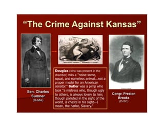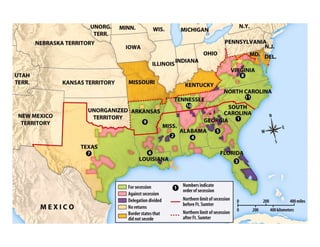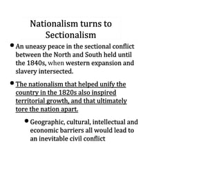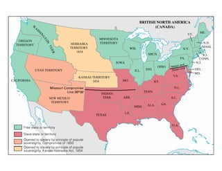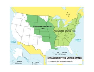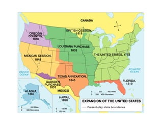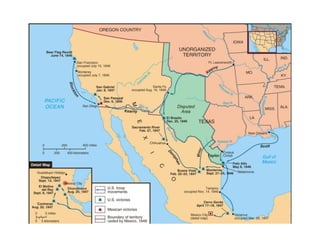 The document discusses the territorial expansion of the United States between 1800-1850, including the annexation of Texas and war with Mexico. It outlines how Texas gained independence from Mexico in 1836 and became its own republic before joining the US in 1845. Disputes over the border between Texas and Mexico led President Polk to send an envoy to negotiate, but when Mexico refused, war broke out between the US and Mexico from 1846-1847, resulting in the US acquiring vast new western territories of California and New Mexico.