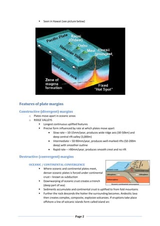 Plate tectonics theory proposes that the Earth's crust is divided into plates that move over time. Evidence for this includes matching geological formations between continents that have since drifted apart. The Earth has a solid inner core, liquid outer core, and mantle below the crust. Plates meet at boundaries that are either constructive, where plates move apart, or destructive, where plates converge. Earthquakes are often caused by stresses building up at plate boundaries. Volcanic activity commonly occurs near plate boundaries as well.