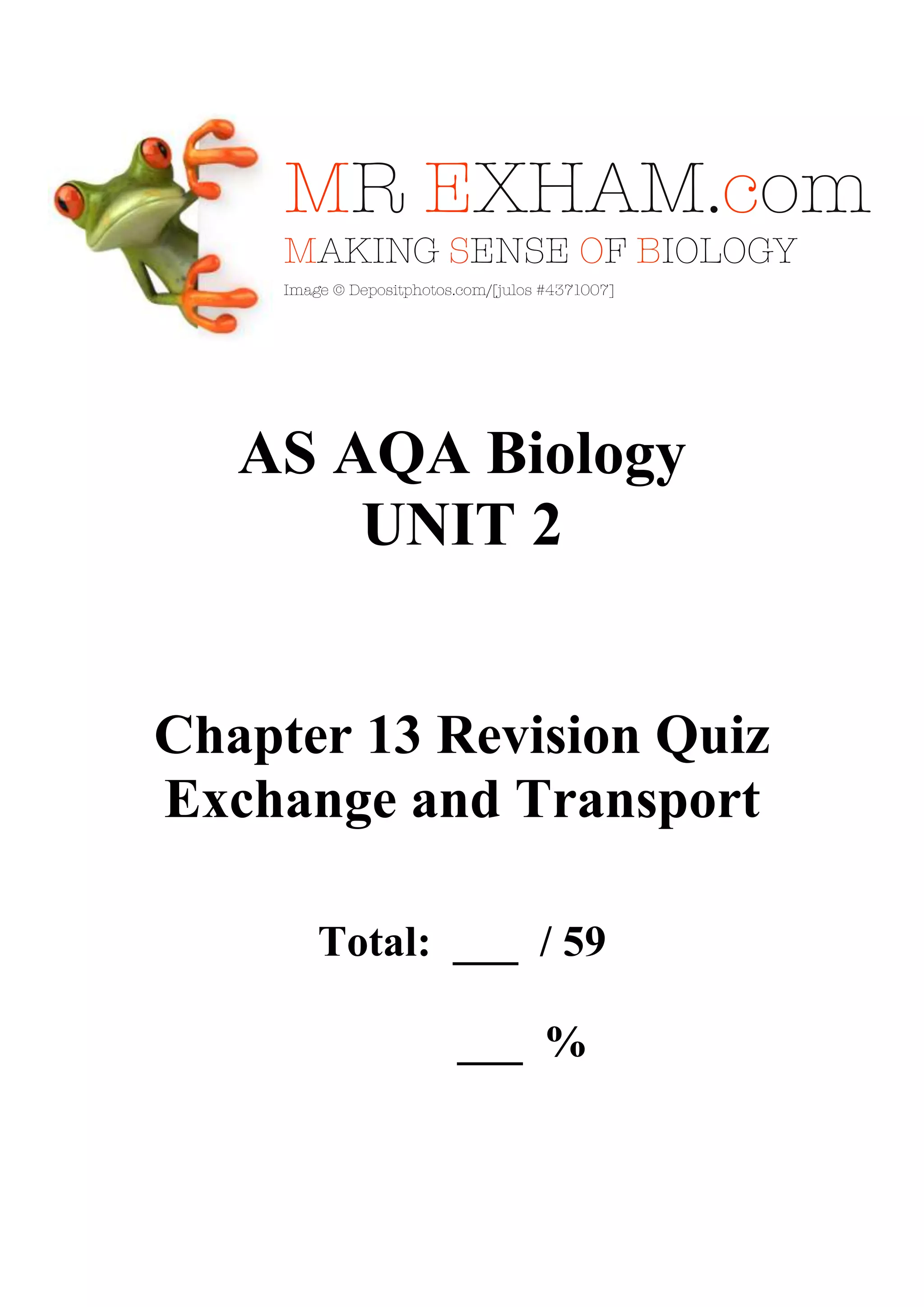 This document contains a 32 question quiz on exchange and transport in biology. It covers topics like the substances exchanged between organisms and the environment, surface area to volume ratios, features of specialized exchange surfaces, gas exchange in single-celled organisms and insects, the tracheal system in insects, stomata, gills, countercurrent flow in gills, chloroplasts in leaves, leaf structure and adaptations for gas exchange, the need for transport systems in larger organisms, open vs closed circulatory systems, single vs double circulatory systems, blood vessel layers, differences between arteries and veins, capillary structure and function, interstitial fluid and lymphatic system, labeling a diagram of circulatory system structures, root hair cells,