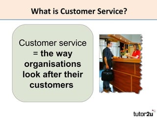 Customer service involves how organizations meet the needs of their customers. It is important for retaining existing customers and attracting new ones. Good customer service differentiates a company's products and keeps customers satisfied. It also provides valuable feedback. While technology has increased competition, customer service remains crucial as customers now expect their needs to be understood and issues addressed promptly. Organizations must listen to customers, build trust, handle complaints respectfully, strive to get things right the first time, empower employees, and go above expectations to keep customers happy.