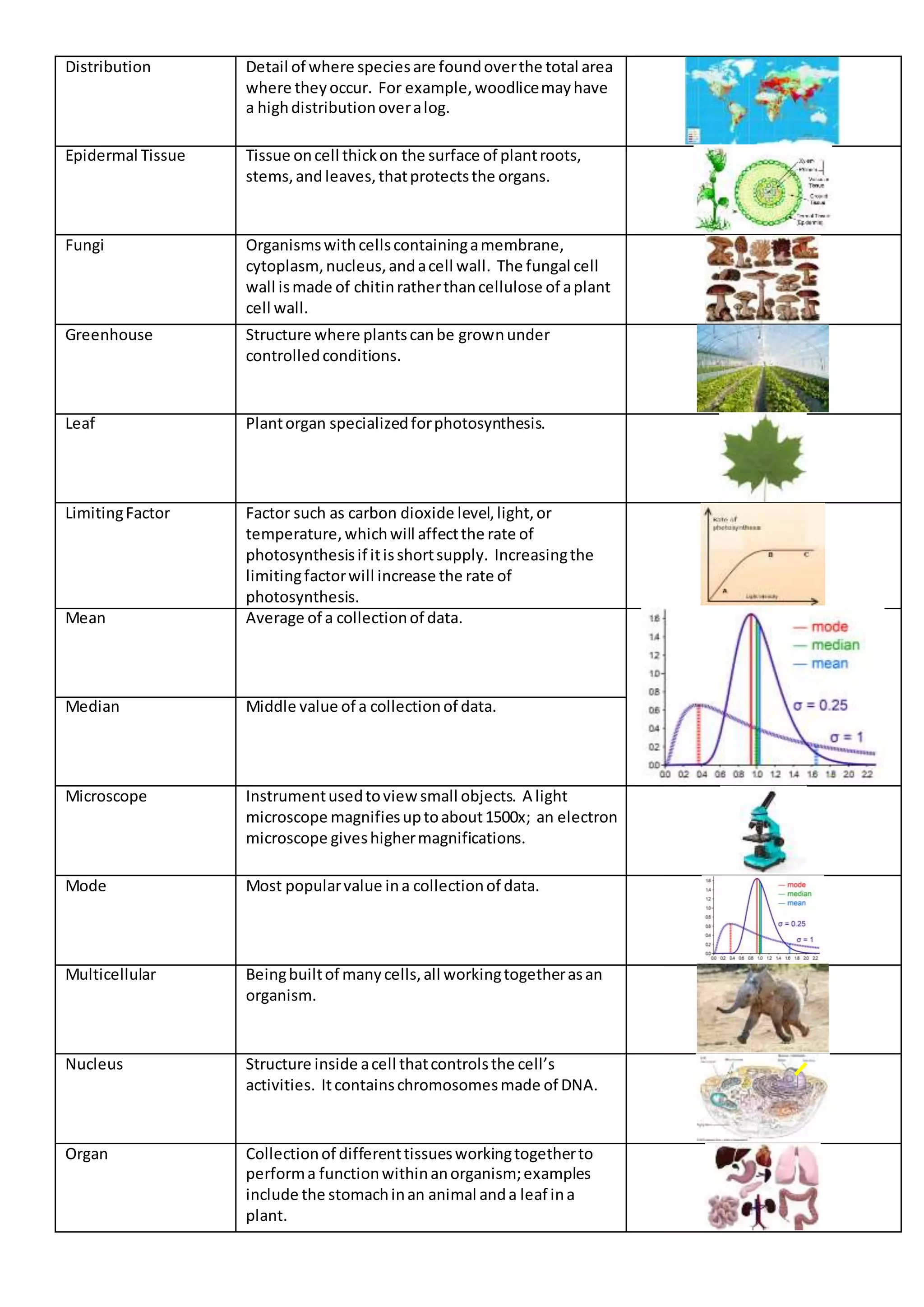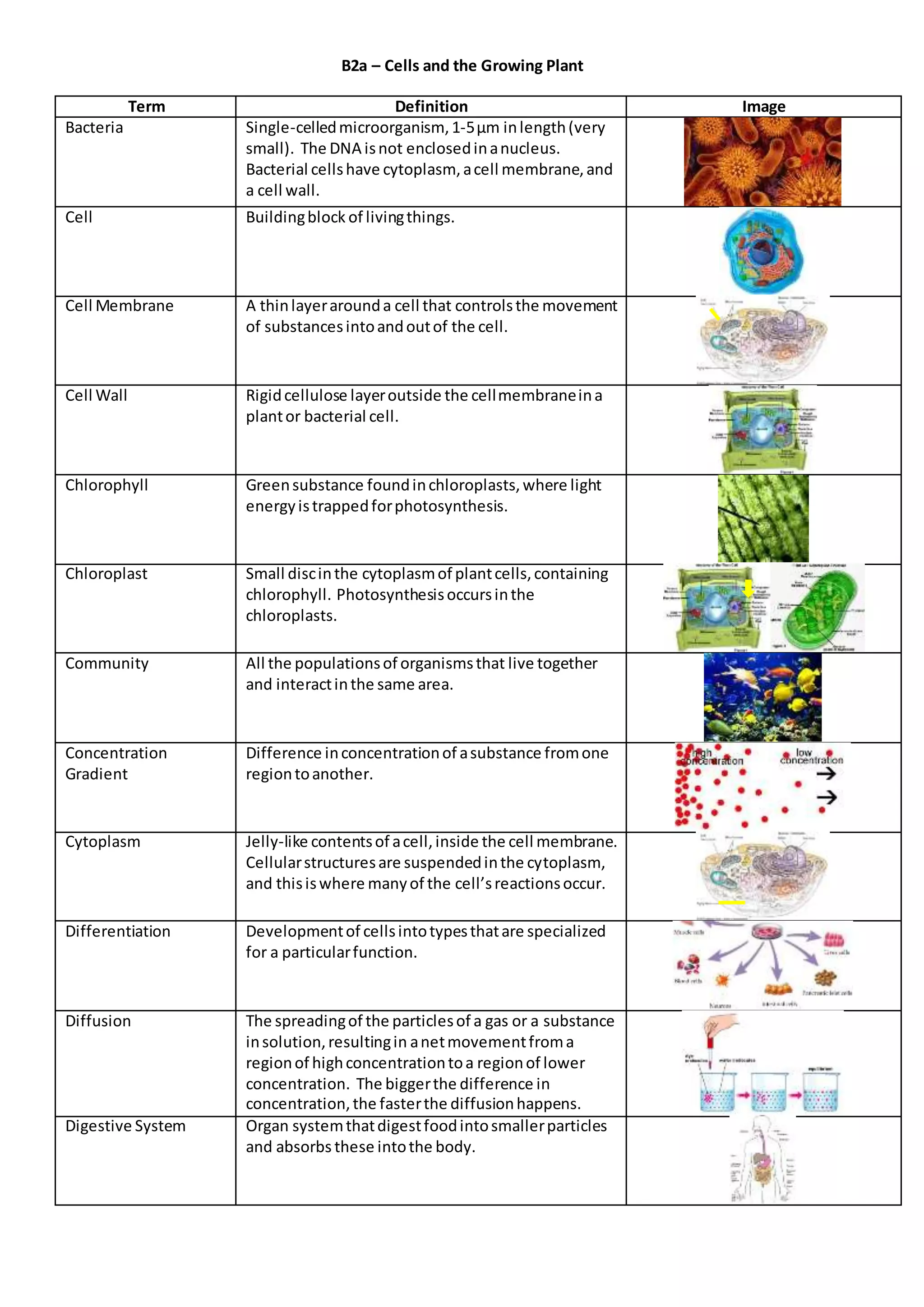 This document defines terms related to cells and the growing plant. It provides definitions for terms like bacteria, cell, chloroplast, diffusion, epidermal tissue, fungi, greenhouse, leaf, limiting factor, photosynthesis, stomata, tissue, and xylem. It describes the structures and functions of plant and bacterial cells, plant tissues and organs, and some of the key processes involved in plant growth like photosynthesis and diffusion.