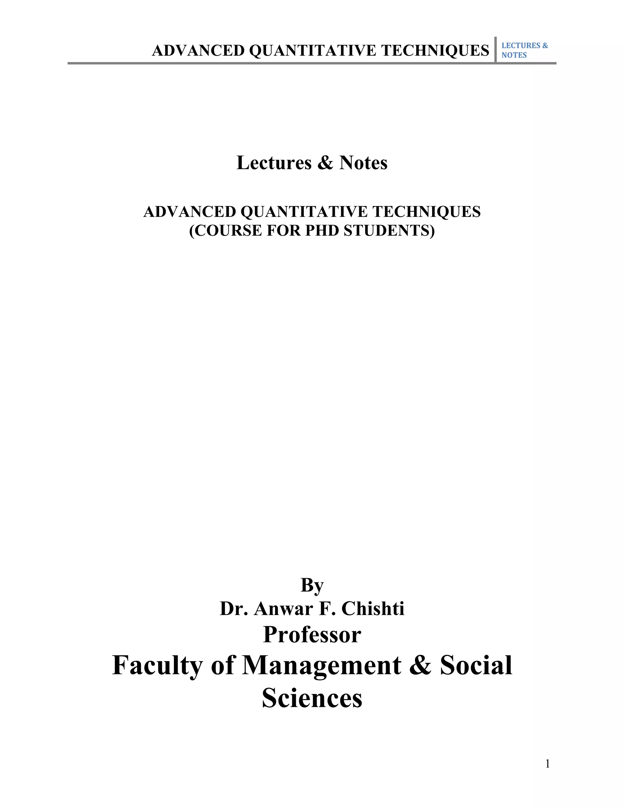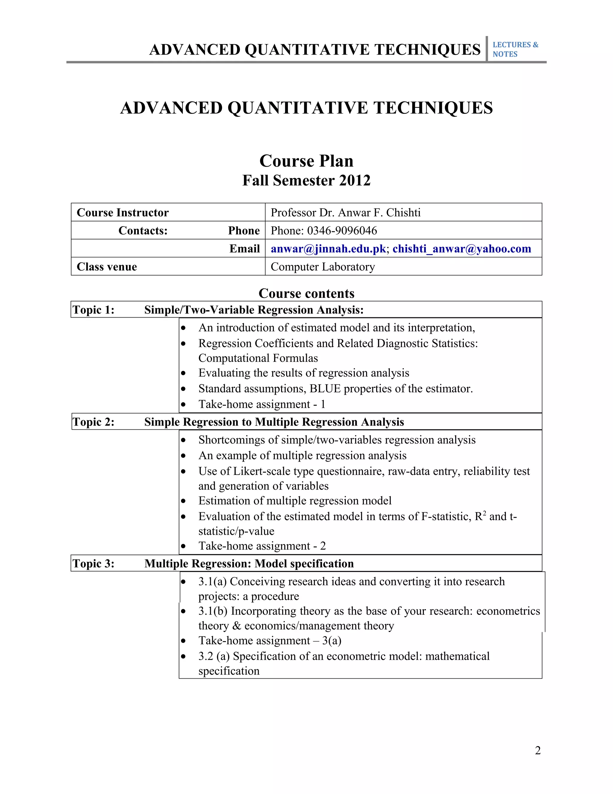 This document outlines the course plan for an advanced quantitative techniques course for PhD students. The course covers topics such as simple and multiple regression analysis, model specification, hypothesis testing of means, dealing with issues like multicollinearity and heteroskedasticity in regression models, and time series and panel data analysis. The course will be taught over one semester with weekly lectures and assignments. Students will be evaluated based on individual assignments, a group research project, midterm and final exams.
