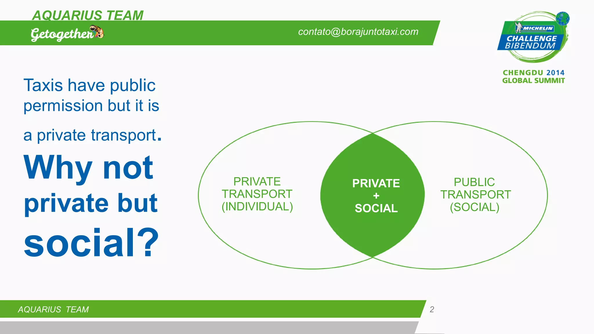 The document discusses the idea of creating a new type of shared transportation network that connects people with similar transportation needs and routes. It aims to address issues with public transportation being unreliable and taxis being too expensive. The proposed system would allow users to enter their transportation itinerary and be matched with others going in the same direction so they can share rides and costs through an approach modeled on the sharing economy. The goal is to launch in Brazil and sign up 25,000 users to generate $7 million in shared rides.